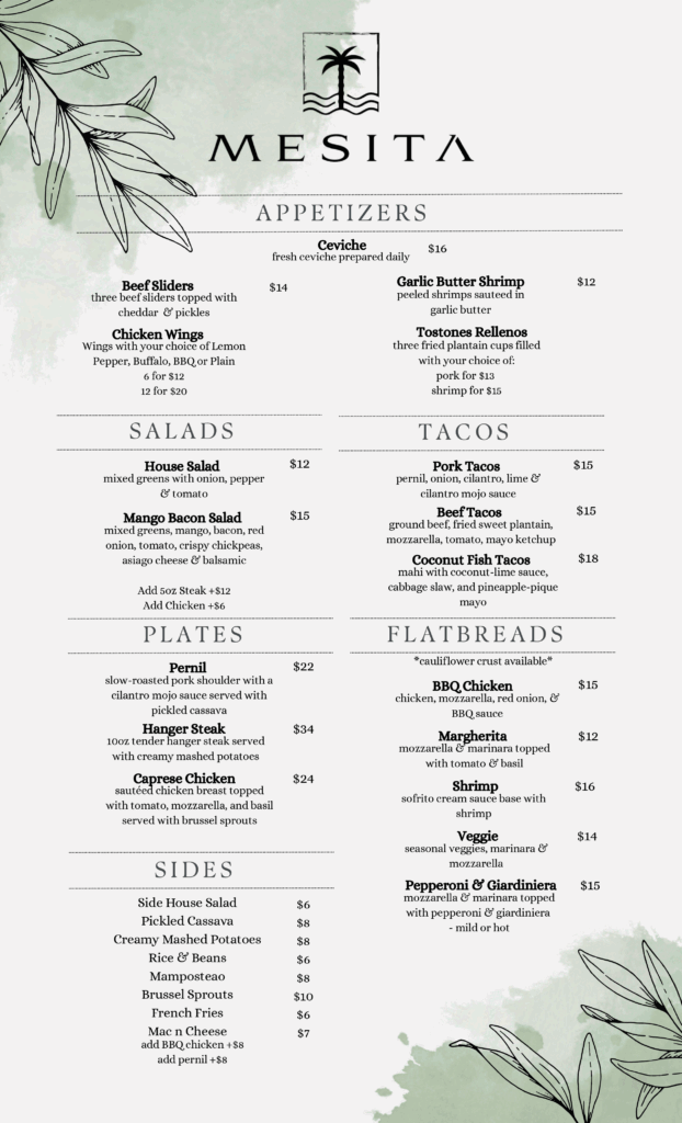 We love food and we love people! At Mesita, it’s simple: we love bringing people together and preparing them delicious food. That’s our promise. We create simple, flavorful dishes with a touch of chef-inspired creativity—made for people to enjoy together. Bring your appetite, bring your friends, and let us make your day in Vieques a little more beautiful.