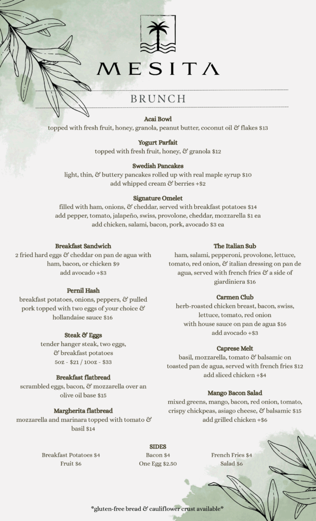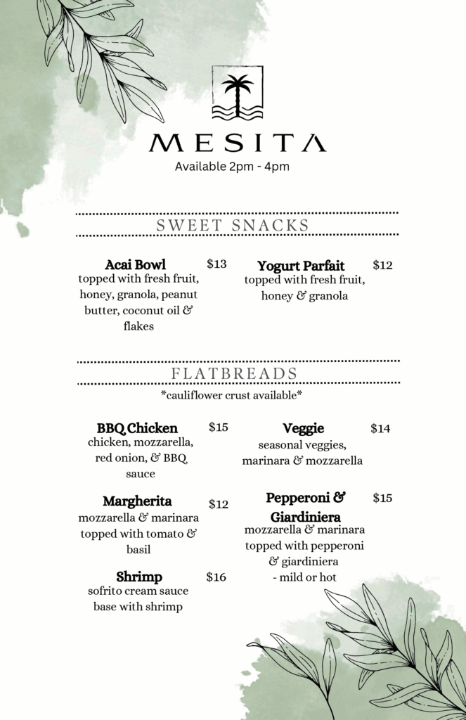 Mesita is open all day, serving breakfast, lunch, and dinner so you can enjoy delicious meals whenever hunger strikes. From sunrise coffee to sunset cocktails, we’re here for you.