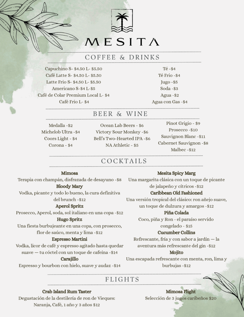 EXCELLENT Based on 89 reviews Posted on Lisa GreenTrustindex verifies that the original source of the review is Google. Excellent brunch! Not far from the ferry drop off...8 minute walk Either new restaurant or newly renovated. Gluten free bread substitutions. All staff were welcoming and customer service oriented. We had a party of 11 and they were able to accommodate. Everyone in our party loved their meal. Thank you so much. It was a perfect experience. 😊Posted on SofiaTrustindex verifies that the original source of the review is Google. The staff was very friendly and easy to talk to both in Spanish and English. My husband and I both ordered the Pernil Hash. IT WAS AMAZING. I recommend ordering a side of avocado. Puertorican avocado is way way better and tastier than in the USA. It was also a very hot day but they have fans and good ventilation. 20/10!!Posted on Jonathan Ben-ZevTrustindex verifies that the original source of the review is Google. My wife and I came to Cafe Mesita on our friend's recommendation. Fantastic spot!! The food was great (we ended up coming back the next day for breakfast too), the atmosphere was lively but relaxed and there were multiple areas for seating, based on the vibe you were looking for. We definitely recommend the Hugo Spritz if you're looking for a refreshing drink. 10/10 would go again - this place is a must if you are visiting Vieques!!Posted on Caroline VladianuTrustindex verifies that the original source of the review is Google. I ate here for lunch and the food was very fresh and great portions. I had the chicken club and it was huge. Very attentive staff and a nice atmosphere.Posted on Mariana OTrustindex verifies that the original source of the review is Google. Beautiful and DELICIOUS!Posted on Ruby WrightTrustindex verifies that the original source of the review is Google. We had an absolutely lovely meal!! highly recommend the tacos and drinks!Posted on Shannon MacKenzieTrustindex verifies that the original source of the review is Google. Quiet place, service was a bit slow, food good but limited options.Posted on samuel hughesTrustindex verifies that the original source of the review is Google. Excellent place, clean friendly, awesome food and craft cocktails. Fresh greens and perfectly cooked protein. Highly recommend.Posted on Chad BurumTrustindex verifies that the original source of the review is Google. A great place. They graciously welcomed a couple of old folks before the kitchen had actually opened. Loved the fish tacos! I imagine this place has a wonderful night atmosphere. Really neat patio area out back and beautiful bar area.Verified by TrustindexTrustindex verified badge is the Universal Symbol of Trust. Only the greatest companies can get the verified badge who has a review score above 4.5, based on customer reviews over the past 12 months. Read more
